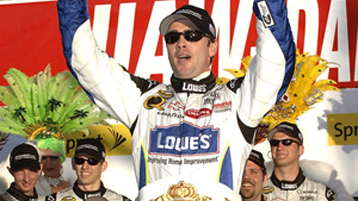 Jimmie Johnson and the No. 48 Lowe’s Chevrolet took advantage of a late-race caution and nosed past race leader Matt Kenseth on the last turn to win Sunday at Las Vegas Motor Speedway.