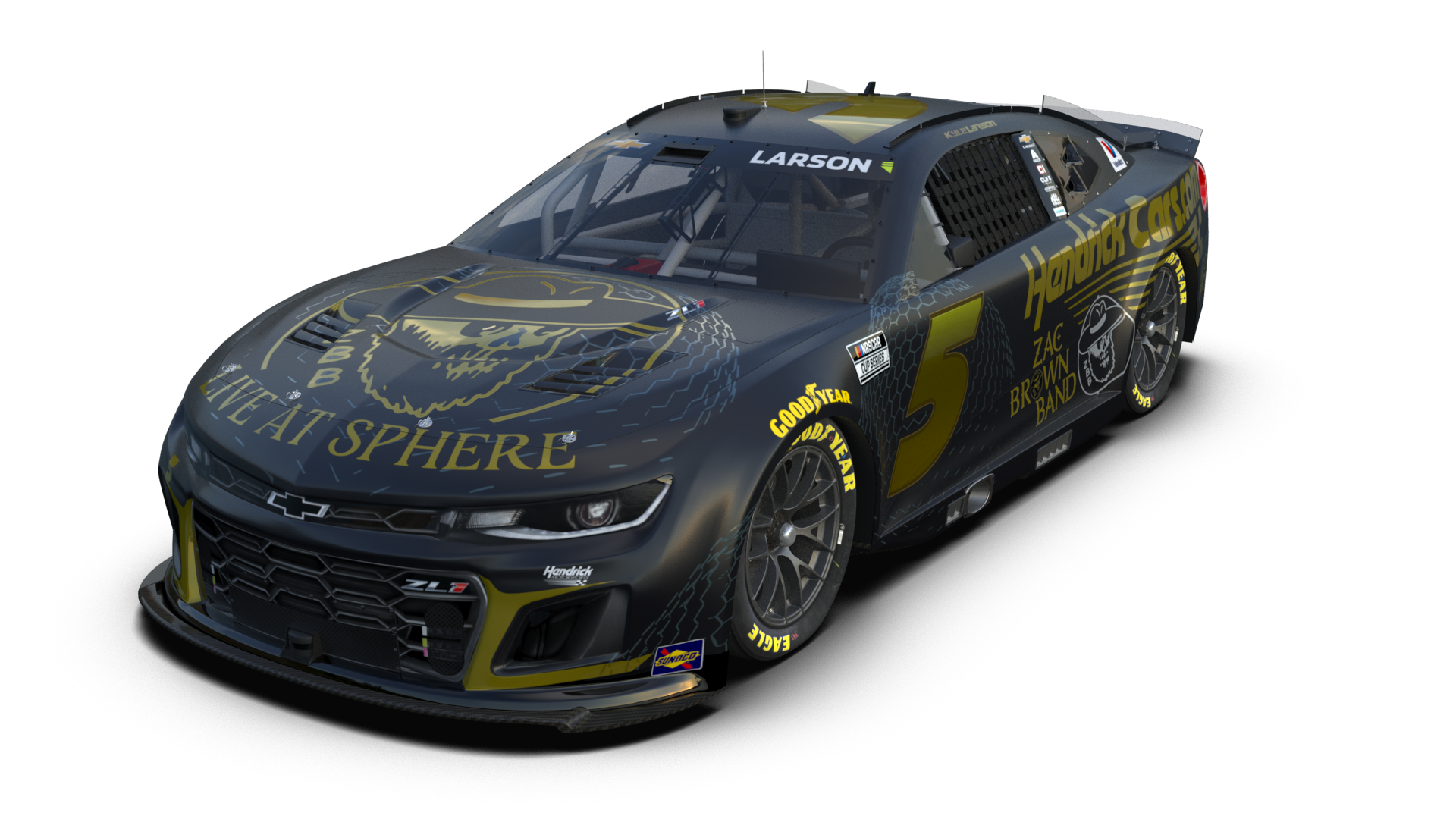 It will be a different look, for sure, for the organization with a pair of schemes making their respective debuts. Kyle Larson will introduce the black and gold, No. 5 HendrickCars.com/Zac Brown Band Chevrolet at Las Vegas Motor Speedway in collaboration with the band's scheduled shows at the Sphere in December and January. Meanwhile, Alex Bowman will premier his green Ally Ad Council livery on his No. 48 Chevy.