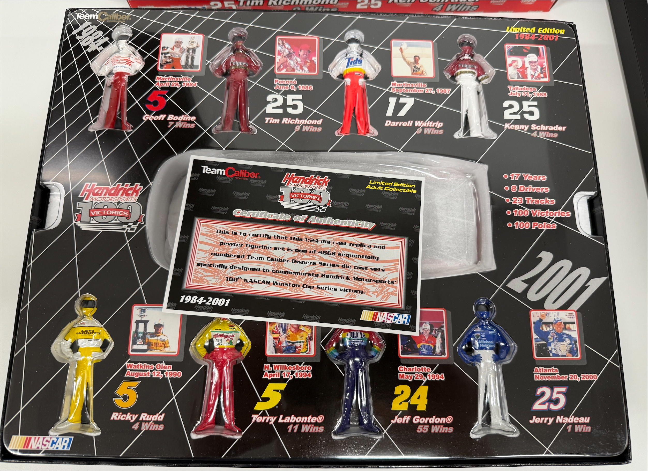 Third, and yet another pull from a deep and dusty box by ol' Sam, comes this gem: A set of action figures in celebration of Hendrick Motorsports' 100th win, which also came in 2001 in an event also won by Gordon at Michigan International Speedway.