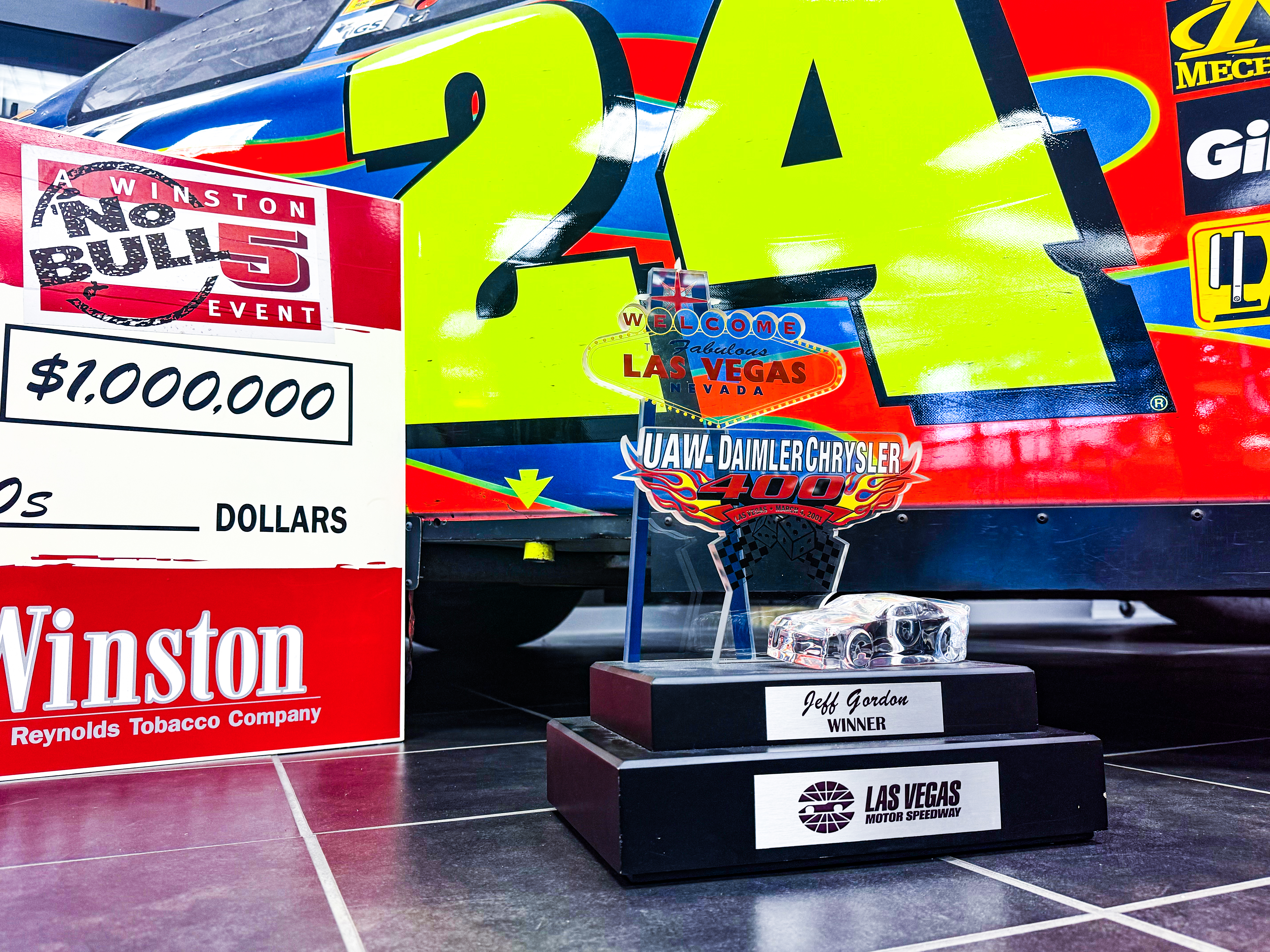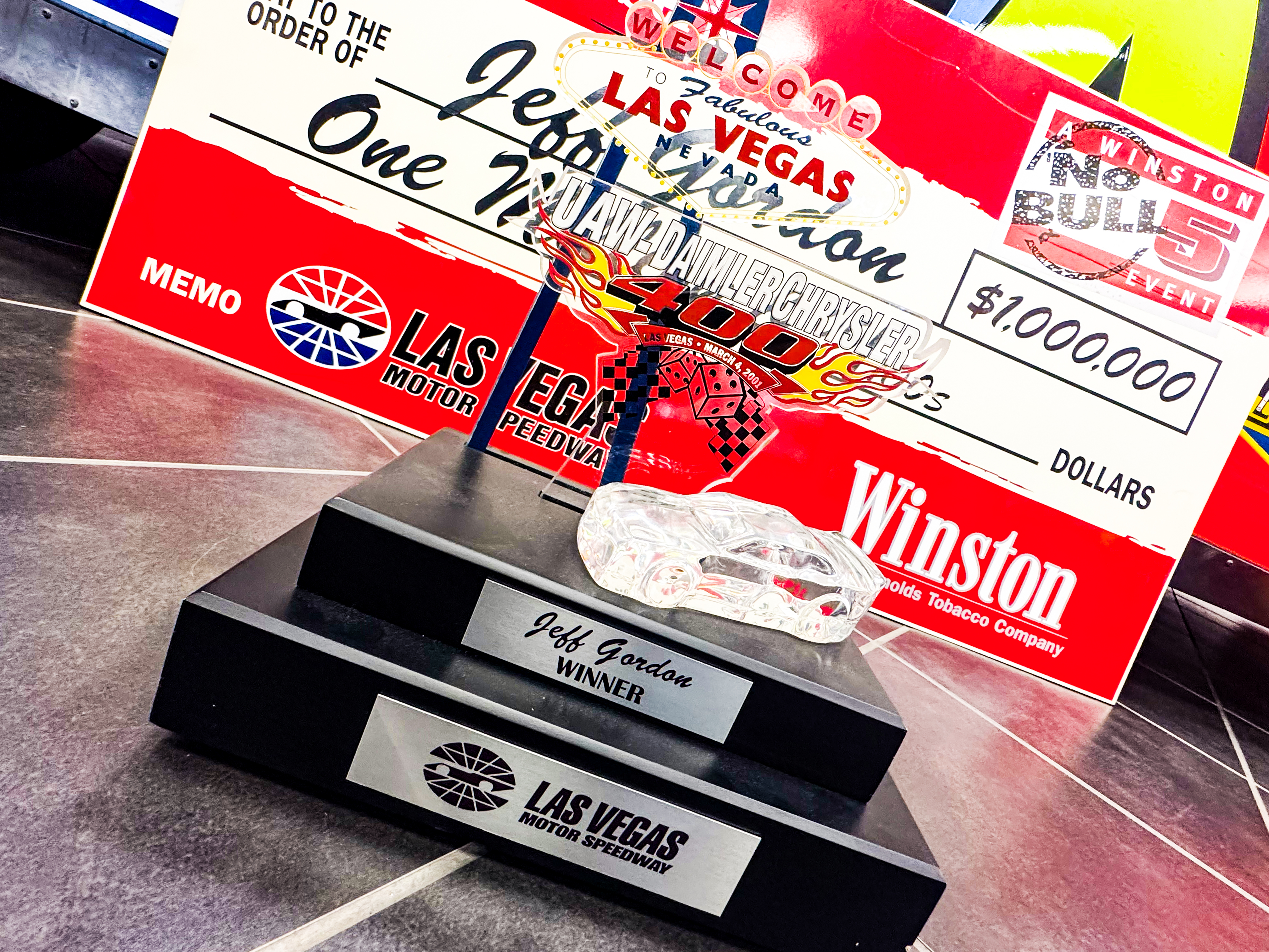 OK, to make it make sense. Behold, the trophy from victory lane in 2001 as Jeff Gordon scored the first of 10 victories (and counting) for Hendrick Motorsports at Las Vegas Motor Speedway. The victory was also part of a NASCAR Cup Series championship season for the No. 24 team.