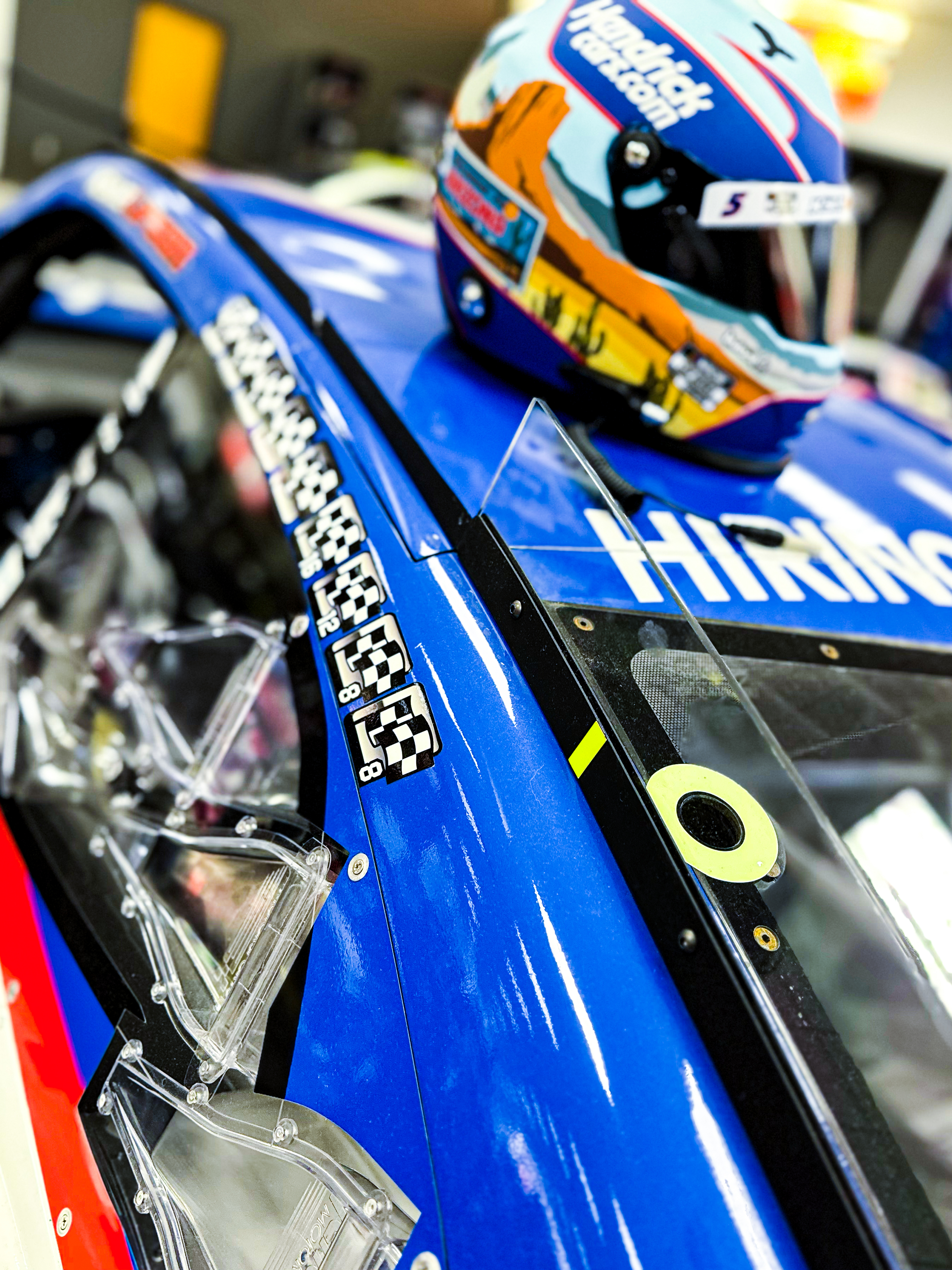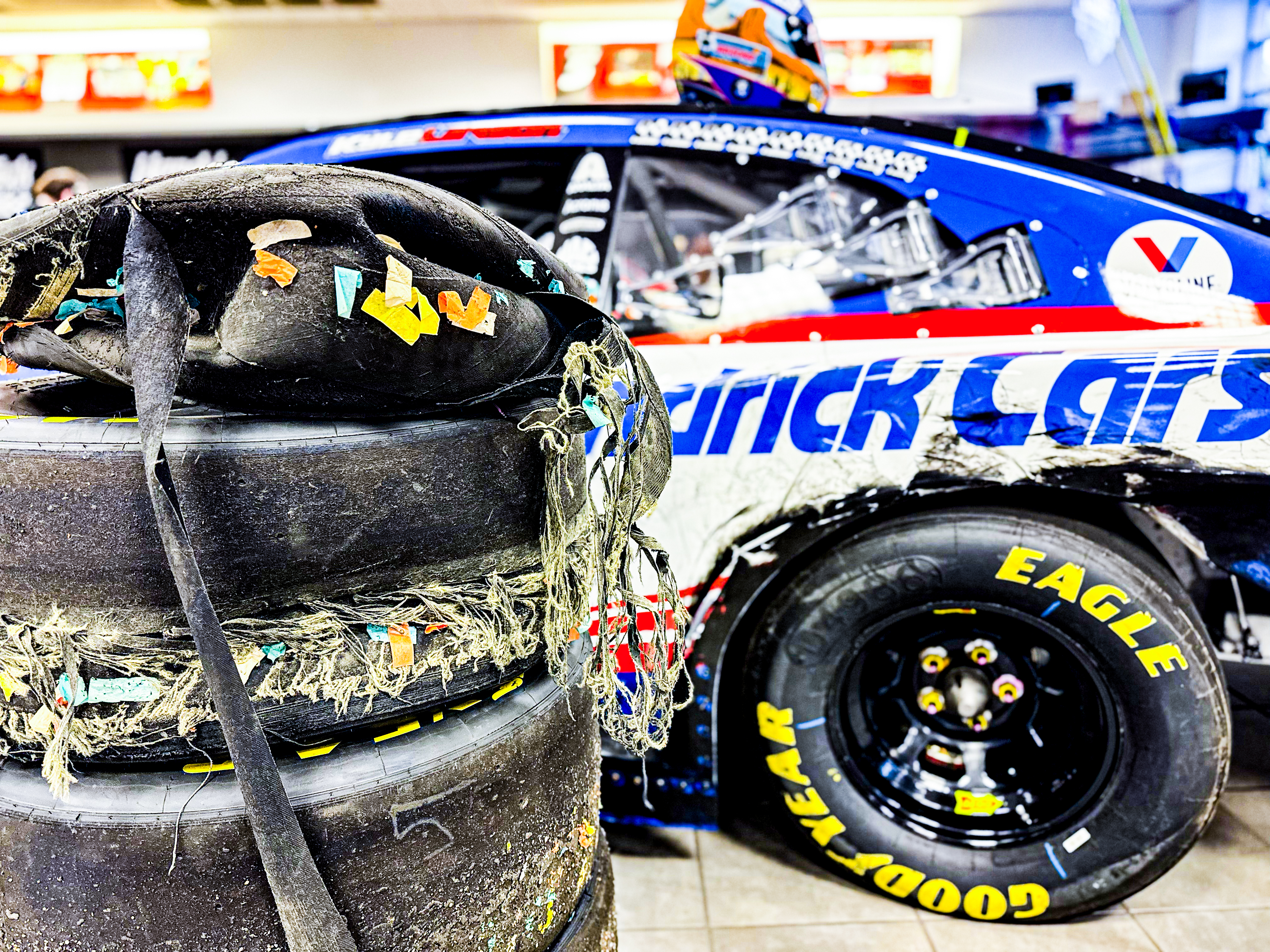 In celebration of Sunday's finale, Sam dug out some tires. In fact, the four that Kyle Larson roasted onto the Phoenix Raceway pavement in 2021 as he celebrated his first career championship. And of course, we found the car as well for a little background color and a nifty Phoenix helmet.