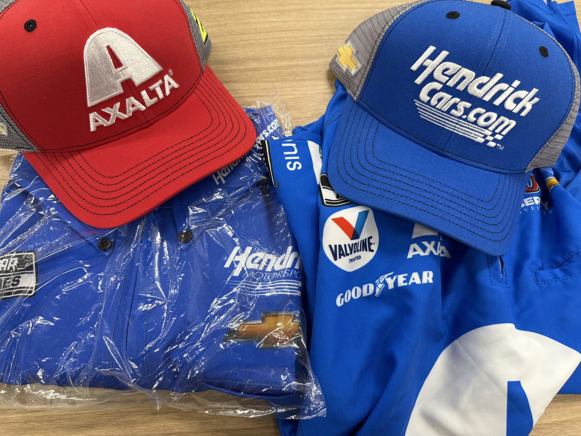 For starters, with two teams heading to Phoenix with a shot to win, Sam threw not one, but two hats and two crew shirts into the mix. One of each is adorned with Axalta branding for Byron while the other shirt and hat bear the blue of HendrickCars.com for Larson. The No. 24 crew shirt is a size large while the No. 5 is an extra-large.