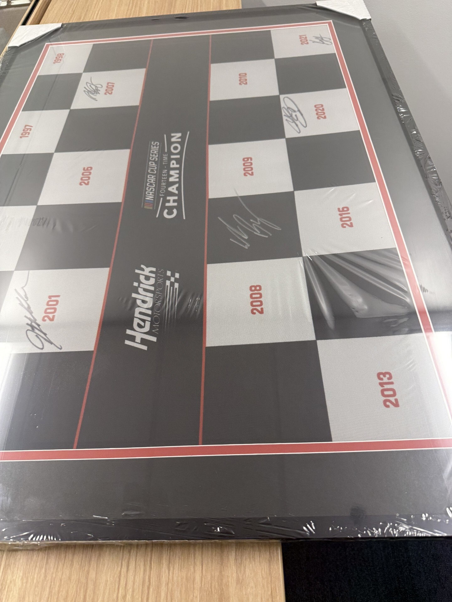 And finally, the coup de gras, a massive Hendrick Motorsports/NASCAR Cup Series champion flag that includes the years of all 14 titles won by the team thus far. It is also signed by Jeff Gordon, Chase Elliott, Alex Bowman, Byron and Larson. The flag is also framed.