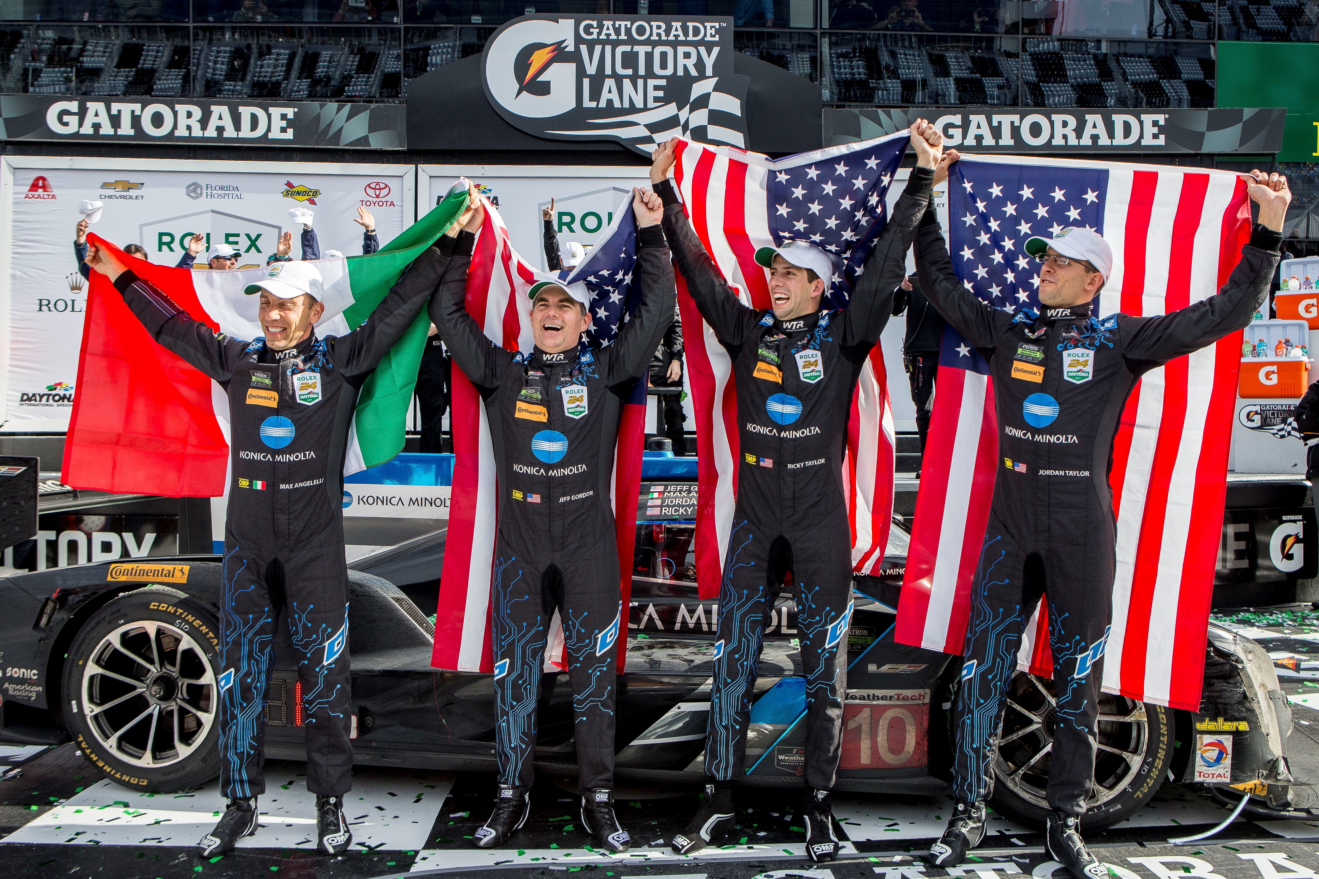 Battling the pole-sitting No. 5 Cadillac DPi entry with about five laps remaining, Taylor had the momentum coming off the banking and into turns one and two. With slower GT cars out front, Taylor saw an opening and went for the lead. When Felipe Albuquerque tried to close to door, he made contact and spun, and the Wayne Taylor Racing crew would go on to win. The 0.671-second margin at the stripe is still one of the closest finishes in race history.