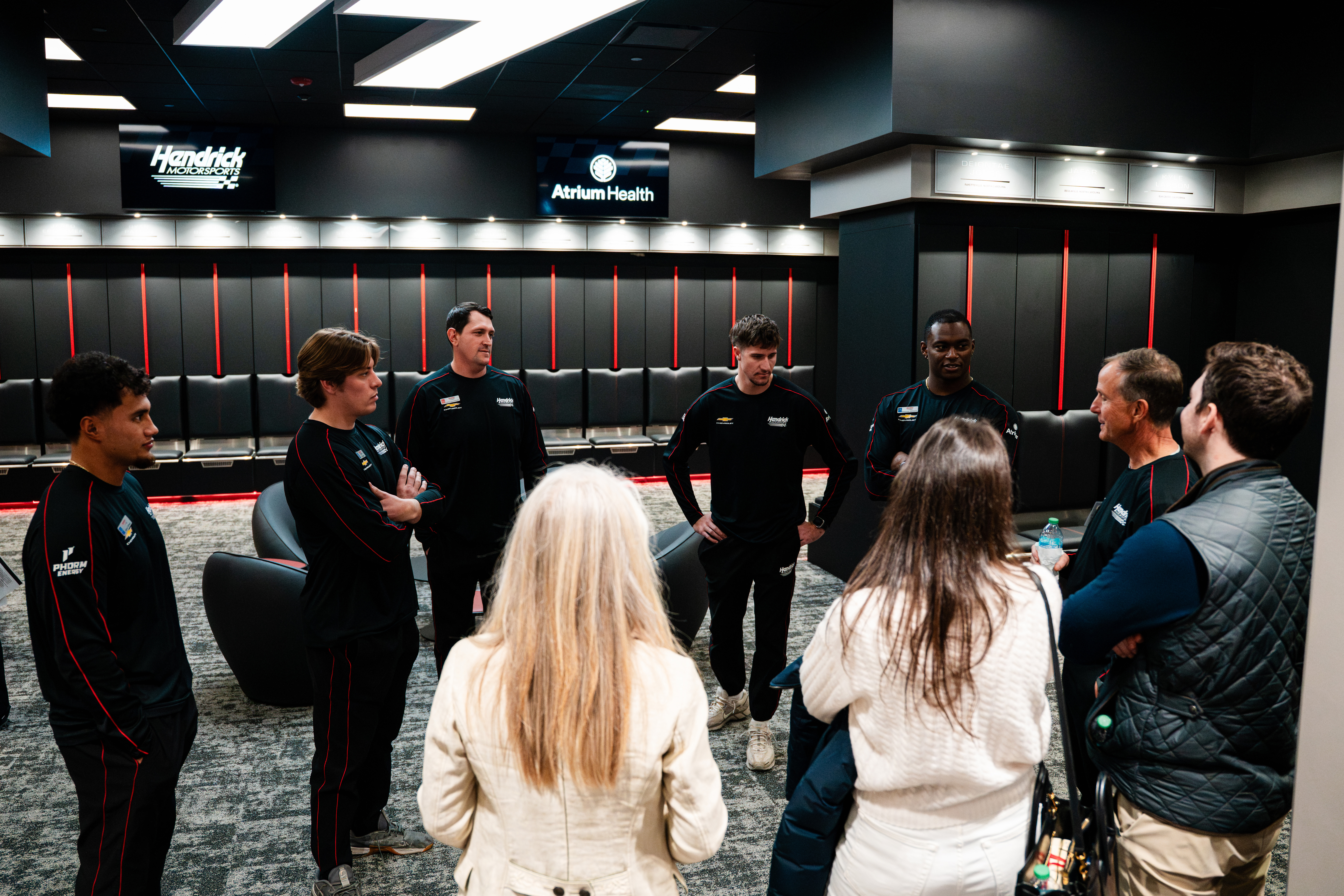 Hendrick Motorsports pit crew members show off their new locker room to guests during the unveiling of the Atrium Health Motorsports Athletic Center on Thursday afternoon.