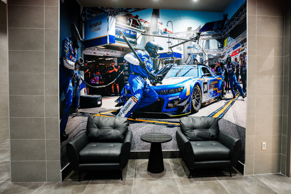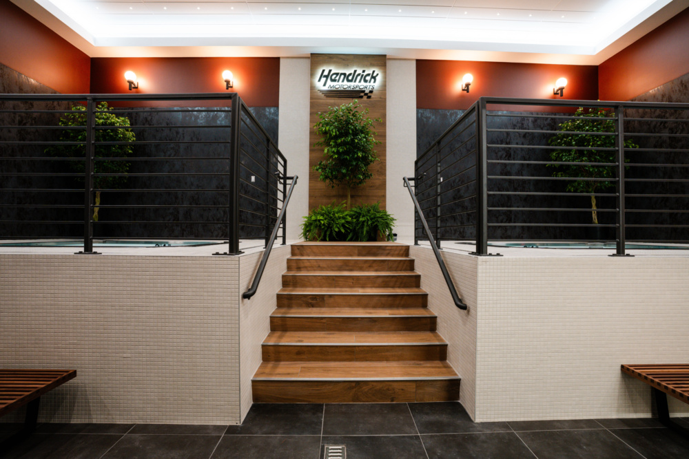 Using such facilities on college campuses, at pro sports facilities and even at Fort Bragg, the effort was a joint collaboration spearheaded in large part by Hendrick Motorsports development manager Roberto Medina and pit development manager Evan Kureczka. With their guidance and input and a collaboration of REDLINE Design Group (architecture), 3TEN Construction (general contractor), ACRO Development Services (civil engineering) and Forty Nine Degrees (branding) the AHMAC represents a game changer in pit crew athlete recruiting and development and beyond.