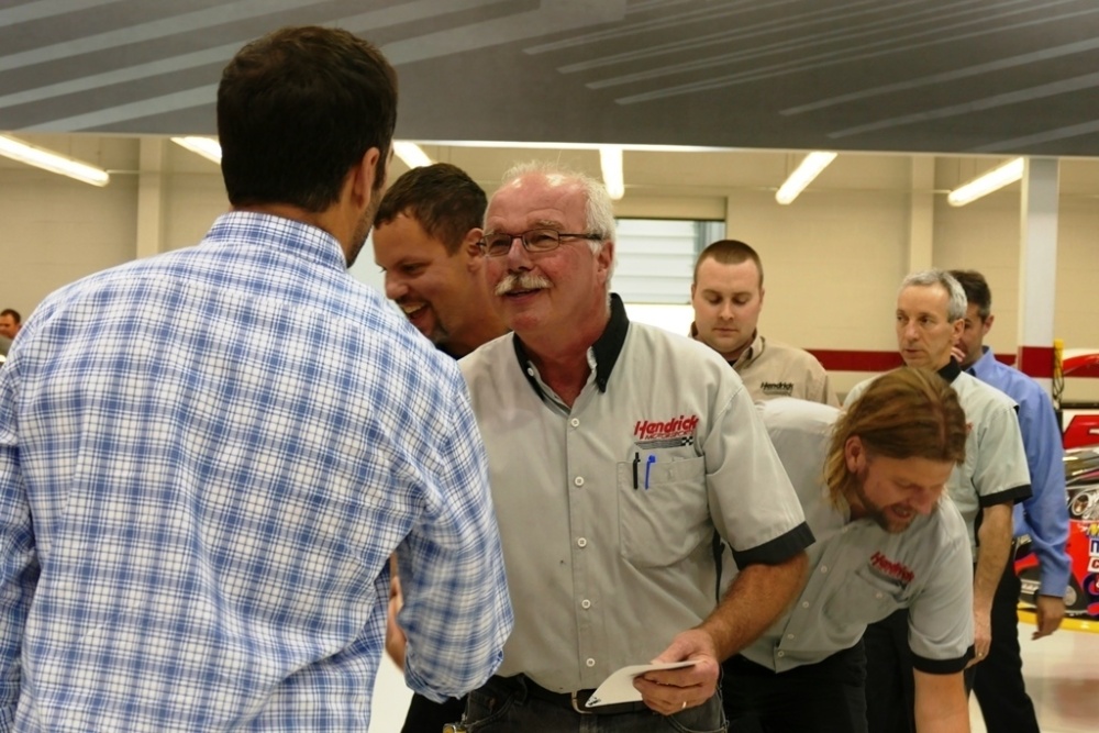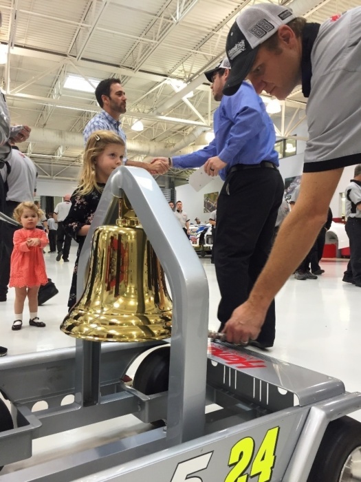 Jimmie Johnson brings the Victory Bell around the Hendrick Motorsports campus to celebrate his Texas win with teammates.
